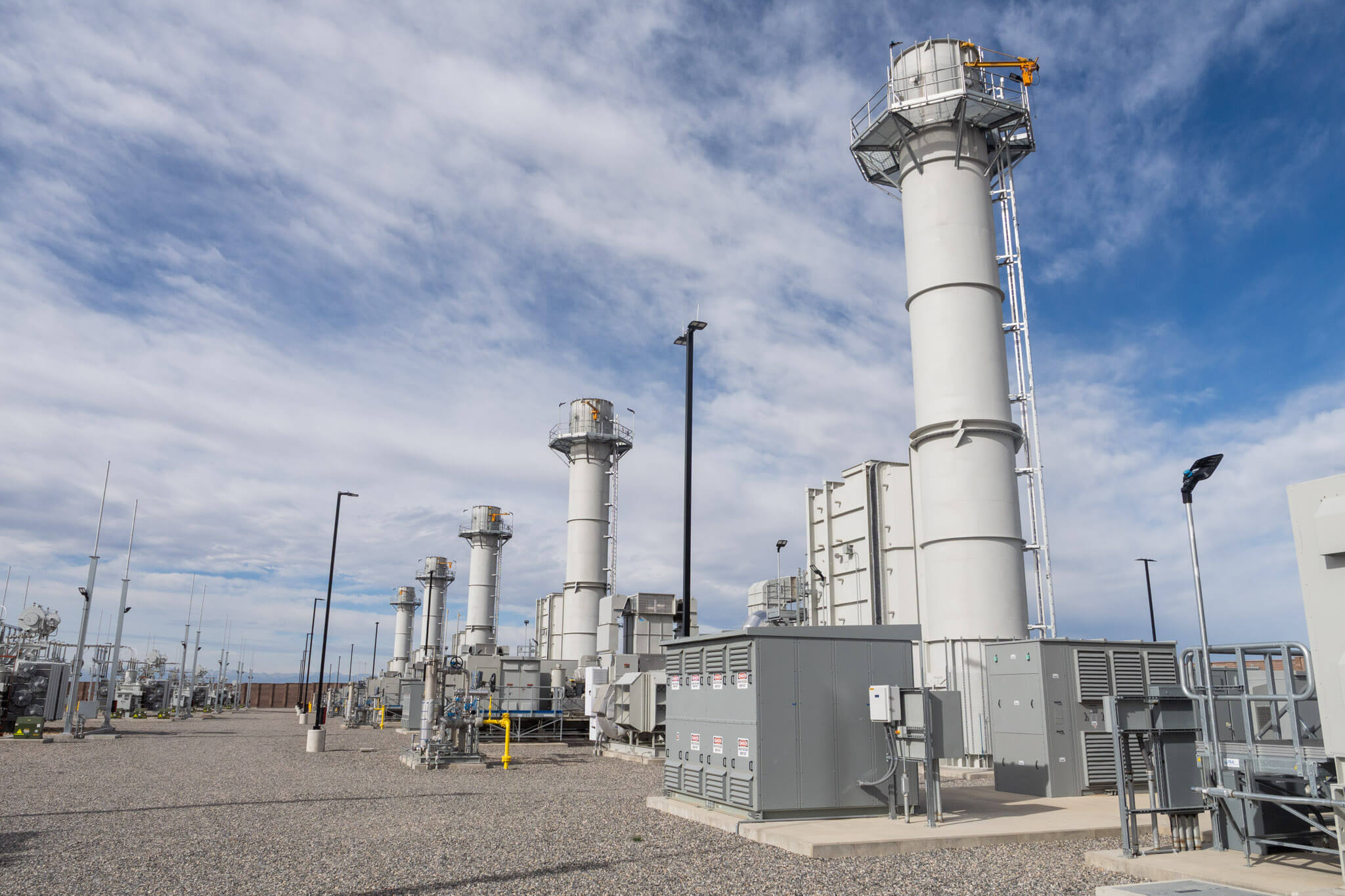 The Mountain Peak Power project adds 162 MW of peaking natural gas capacity through six General Electric LM2500XPRESS combustion turbine generators. The LM2500XPRESS units offer quick and reliable power during peak demands with reduced emissions and connect to a 69 kV transmission system at the site’s United Power substation. The United Power substation includes a battery energy storage system that supports the 69 kV transmission system.