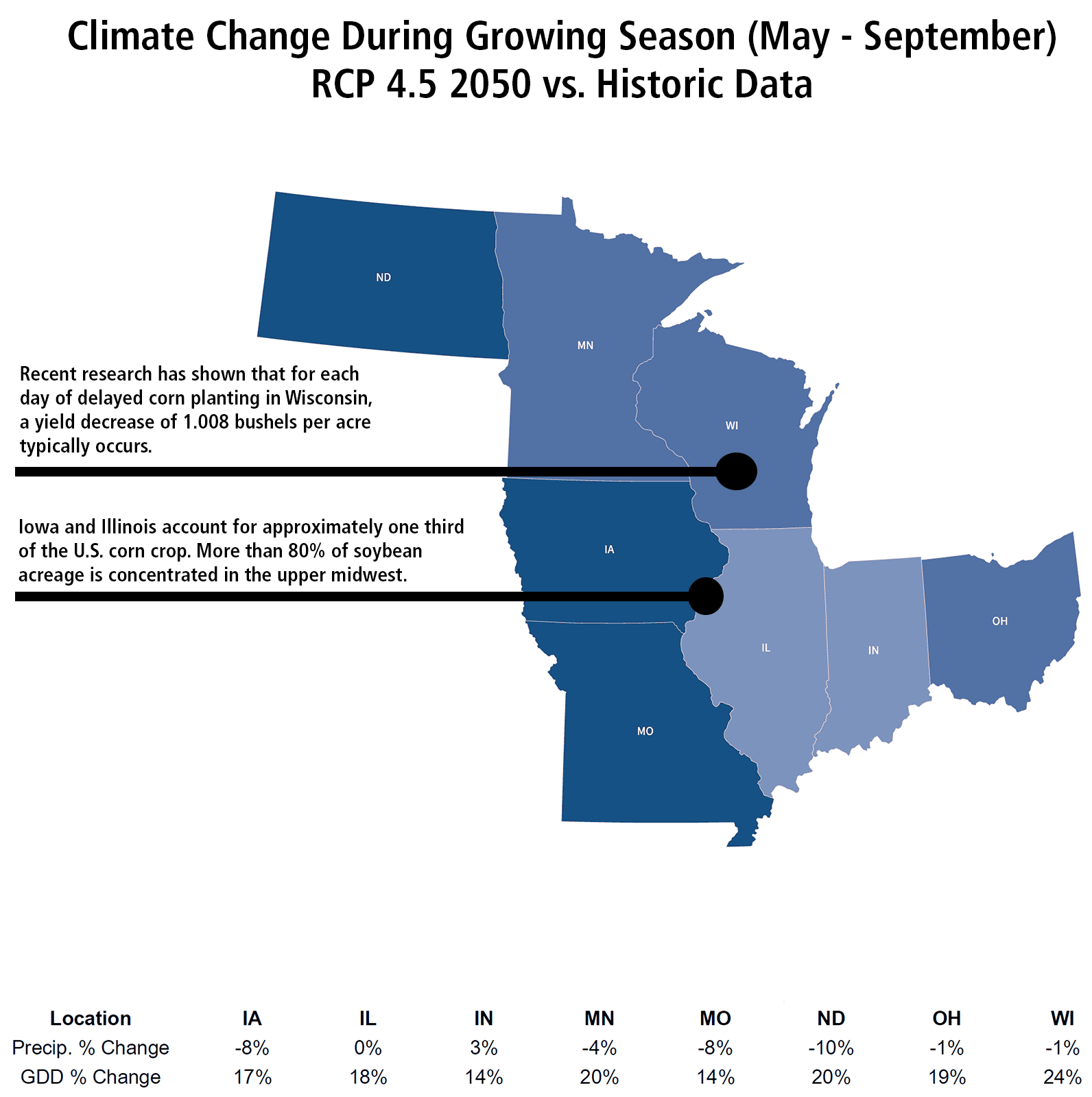 Resilient Analytics served as the physical risk consultant for this project, responsible for analyzing potential impacts on regional agriculture production. A key focus was the potential for rising temperatures to affect corn production throughout the upper midwest. These temperature changes are impacting seasonal schedules and overall production.