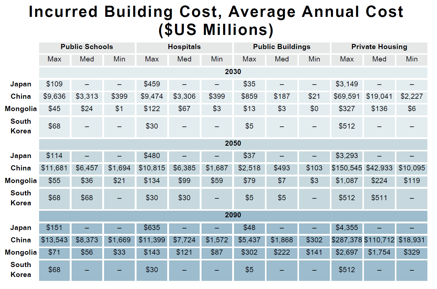 Resilient Analytics was the lead consultant in this effort to determine the economic costs of climate change in the building sector in South Korea, Japan, Mongolia and China. The team focused on residential structures as a primary risk for long-term costs. The team collaborated with economists from Asian Development Bank to develop cost estimates at both national and urban levels.