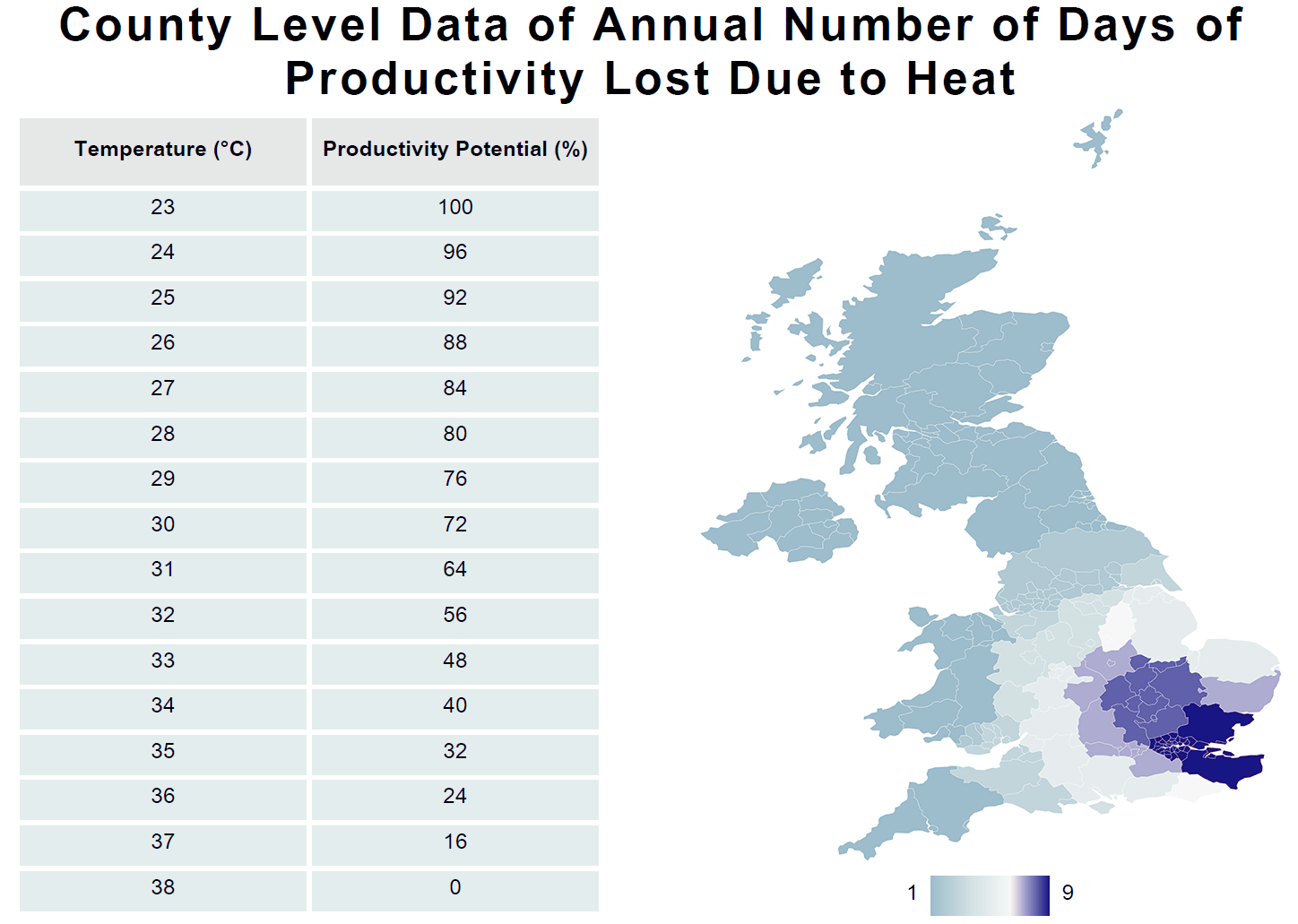 Rising temperatures are causing a decline in productivity, particularly in the southeastern part of the UK.
