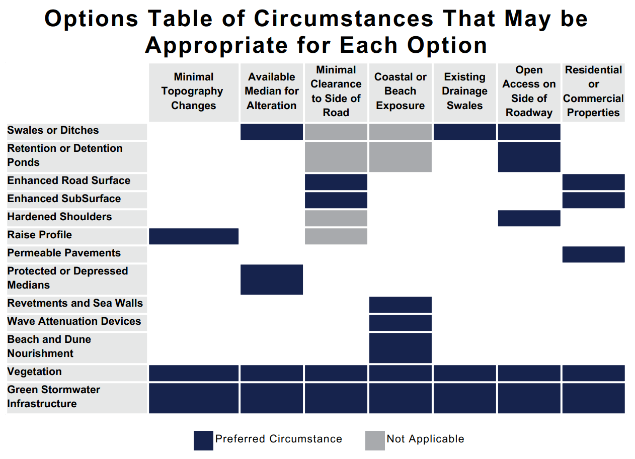 Resilient Analytics developed a set of scenarios across six road types that covered each of the primary threats envisioned in the Hillsborough area over the next 20 years. The team developed a toolkit that provided multiple engineering-based options for each of the prototype scenarios. For each scenario, cost implications and development constraints were included to provide a full set of scenario parameters.