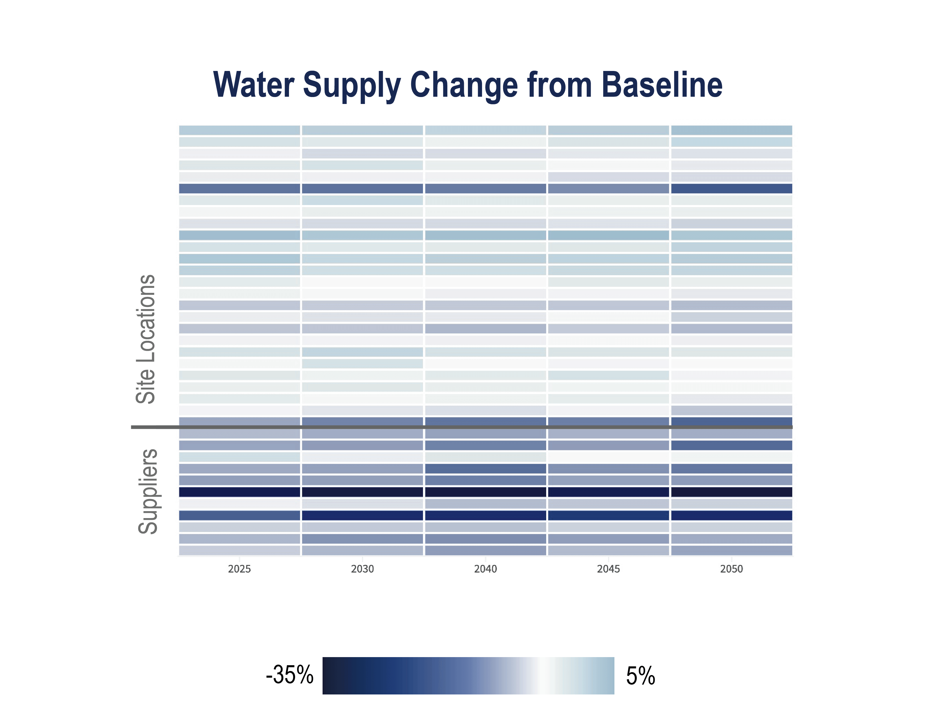 Resilient Analytics utilized its large-scale inventory techniques to analyze each location for drought risks under the multiple scenarios and time slices. The team developed enhanced drought functions to determine potential increases and decreases in available water supply at each location. The team delivered drought risk assessments for each site and within financial reporting requirements.