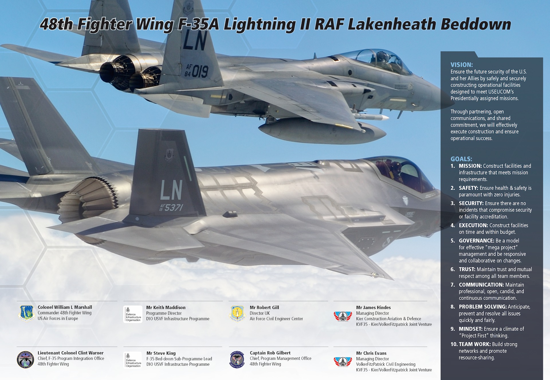 Royal Air Force Lakenheath was named the first U.S. European beddown location for the F-35A in December 2015 by the Office of the Secretary of Defense. The U.S. Air Force’s 48th Fighter Wing (48 FW), the installation management executive, began planning a construction program that included 20 military construction (MILCON) projects and another 10 facility, sustainment, restoration and modernization projects. The 48 FW retained Leidos, with Stanley Consultants as a principal subconsultant, to provide on-site program and project management services.  Together, the two firms enabled the delivery of over $800 million in design and construction of facilities and infrastructure for the F-35A beddown, medical treatment facility recapitalization, DoDEA High School and AAFES Exchange at RAF Lakenheath, United Kingdom. Leidos, with subconsultant Stanley, initially mobilized four personnel to manage the program, increasing in number to 16 personnel embedded in the 48 FW Program Integration Office (PIO).